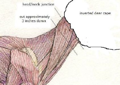 2) After completing your 3 cuts pull the skin forward to expose the head/neck junction. DO NOT CUT DOWN THE BACK OF THE NECK INTO THE BACK. There is no reason to cut the cape down the back of the neck when skinning a deer. KEEP THE CAPE WHOLE.